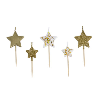 Deze prachtige gouden sterren taartkaarsjes zijn de perfecte manier om elke verjaardagstaart, jubileum of speciale gelegenheid te laten schitteren. ze voegen direct een feestelijke en elegante touch toe aan je gebak en creëren een onvergetelijk moment bij het uitblazen van de kaarsjes. In de verpakking zitten 5 verschillende soorten kaarsen; 3 grote kaarsen, deze hebben een gouden glitter kleur, een mat gouden kleur en een witte kleur met daarop gouden glitters. Verder heeft de set 2 kleine kaarsen, een witte met gouden glitters en het andere kaarsje is geheel goud.