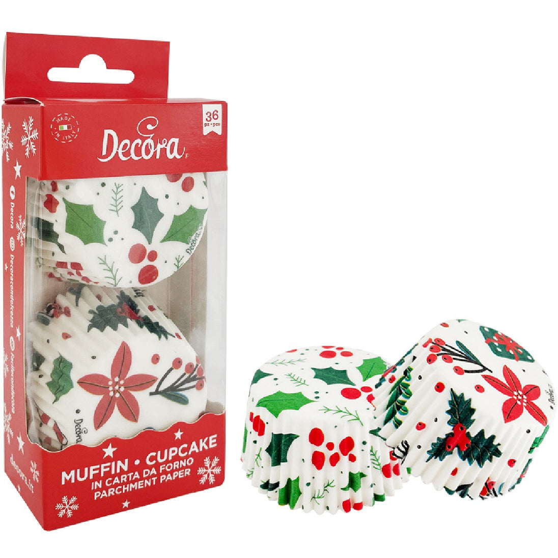 De Cupcake Vormpjes Kerst Best Wishes van Decora hebben een prachtig Kerst thema. Deze bakvormpjes hebben een witte kleur en zijn versierd met onder ander rode besjes, hulstblaadjes en cadeautjes. Combineer deze vormpjes met een rode of groene botercreme en sprinkles en je bent klaar voor de kerst!