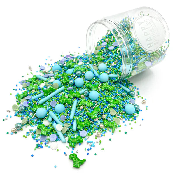 Reguliere prijs €7,90Wie wilde er als kind geen dinosaurussen? Met deze sprinkle mix kun je ze weer tot leven brengen! Rooooar!!! Naast de kleine T-Rex dinosaurussen vind je blauwe, groene en zilveren chocolade parels, blauwe staafjes en blauwgroene... -