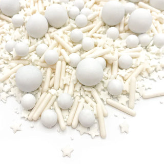 Met onze Milky Way sprinkle mix worden uw taarten, cupcakes, etc. klassiek elegant en ongelooflijk stijlvol! De grote ballen bevatten heerlijke krokante koekjes, de kleine ballen zijn gevuld met chocolade en in de staafjes zit zelfs rauwe spaghetti! Kleine sterretjes en pareltjes maken de mix helemaal af. Een droom in het wit! Het hoeft niet altijd fel en kleurrijk te zijn;
