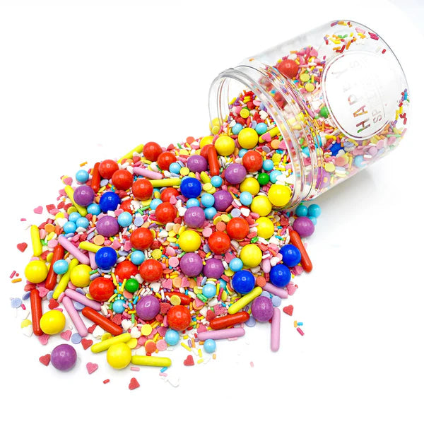 Reguliere prijs €7,90De Happy Sprinkle- Cosmic Galaxy mix is betoverend en cartoon het neemt je mee op een reis door het universum. De grijze raketten schieten ons de Melkweg in en we landen tussen planeten en fonkelende sterren.... -