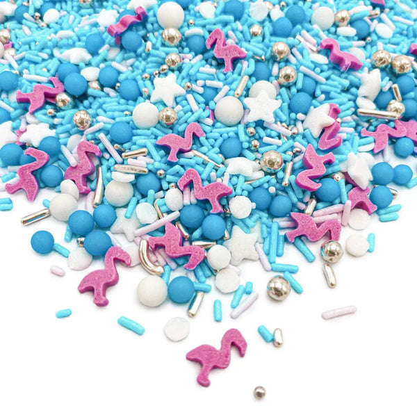 Het lijkt wel een tropisch strand met deze vegan sprinkles. Een lekker zonnetje, zeebriesje erbij, plezier aan het zwembad. Deze sprinkle mix maakt van jouw baksels een echte blikvanger! de mix van blauwe en witte stokjes, roze flamingo's gecombineerd met blauwe parels een echt vakantie vibe!