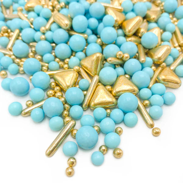 Jongens Bende. Vintage gouden staafjes en parels gecombineerd met lichtblauwe chocoladeparels een harmonieuze sprinkle mix die direct de aandacht trekt en waar iedereen blij van wordt.
